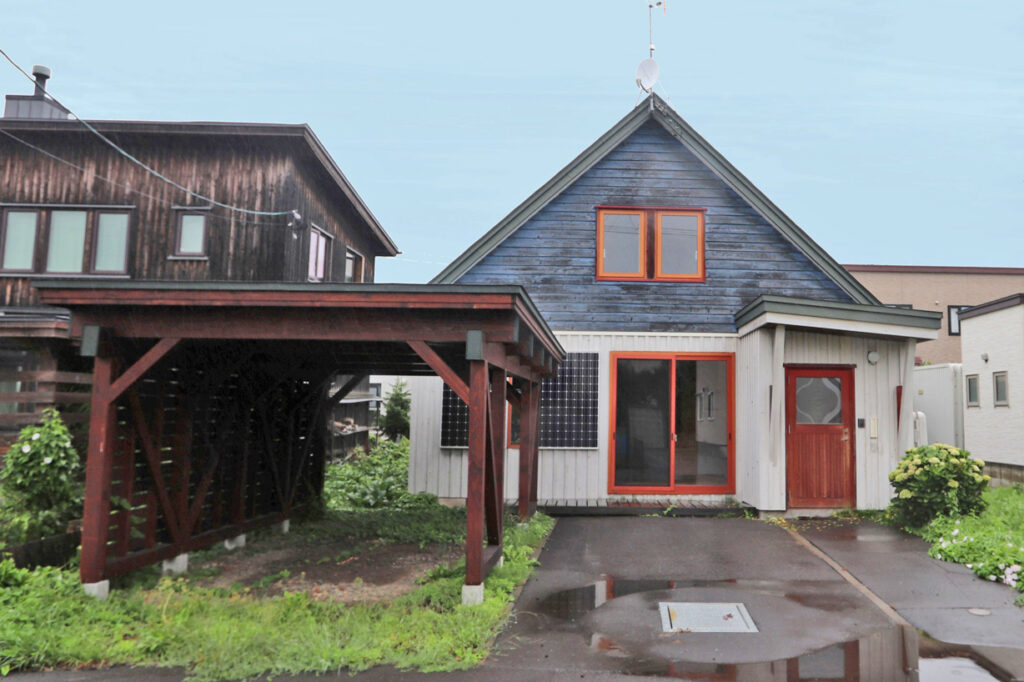 物置と玄関横の太陽自家発電パネル、排雪に便利な融雪槽